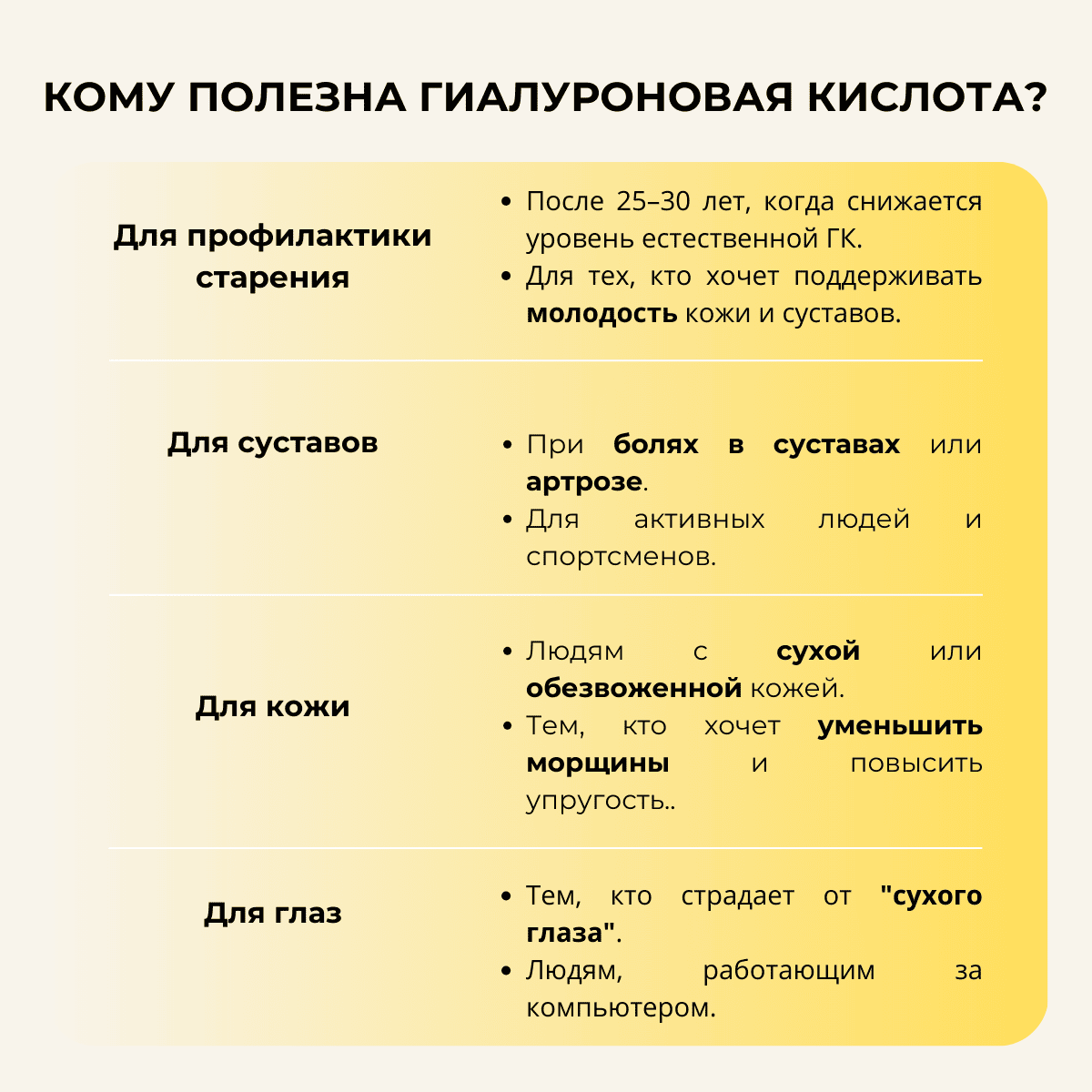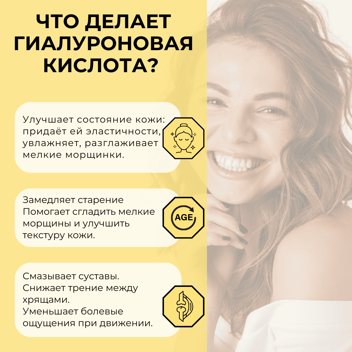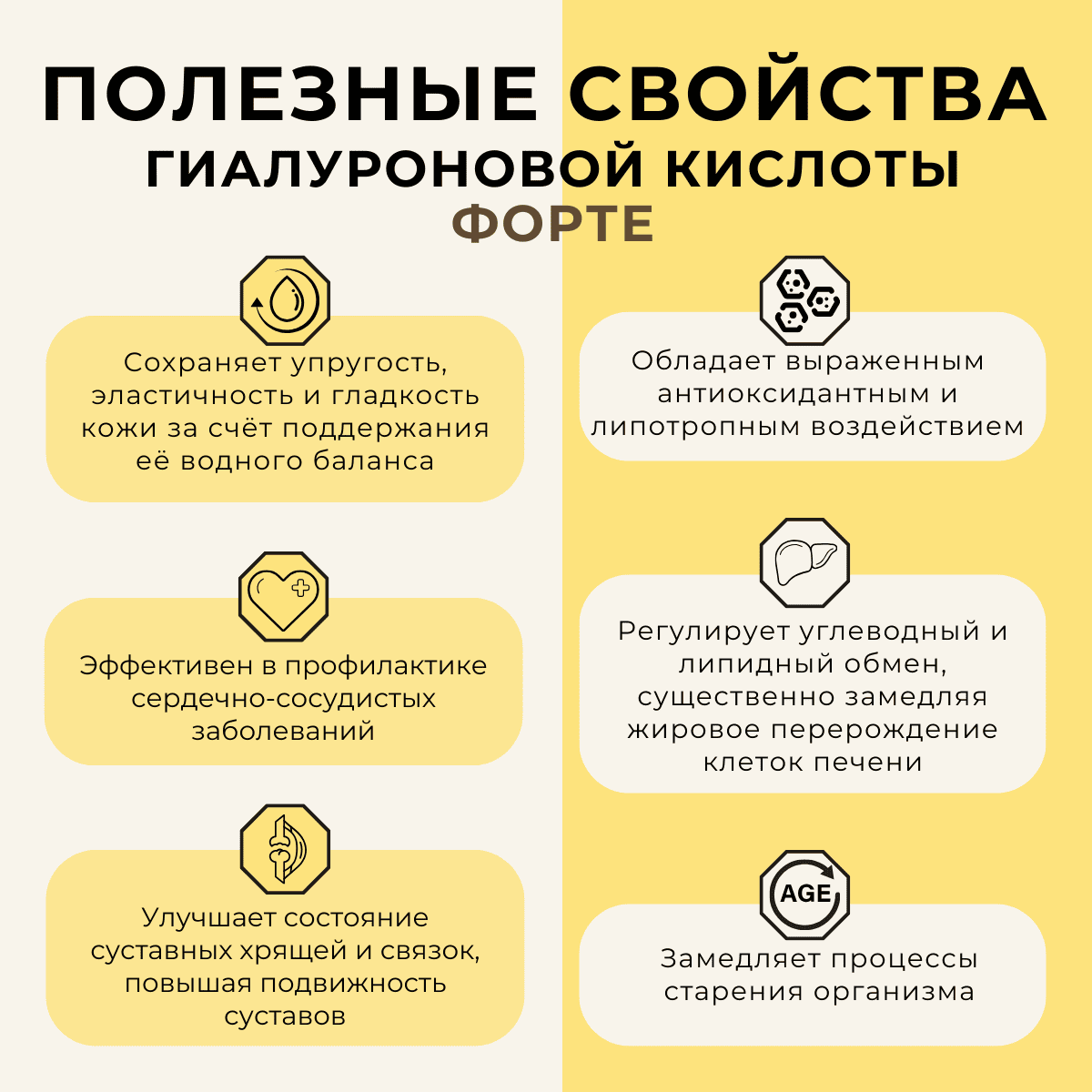 Гиалуроновая кислота присутствует во всех тканях организма и играет важную роль в поддержании водного баланса в клетках и межклеточном пространстве, поддерживает упругость, эластичность и гладкость кожи на тканевом уровне, способствует восстановлению суставных хрящей. Гиалуроновая кислота необходима для восстановления и поддержания водного баланса кожи, профилактики заболеваний опорно-двигательного аппарата, замедления процессов старения. Кроме того, употребление гиалуроновой кислоты снижает утомляемость глаз, сохраняет конъюнктиву увлажненной даже при длительной работе за компьютером и использовании контактных линз. Облегчает состояние при атопическом дерматите, способствует предотвращению климактерических расстройств. Гиалуроновая кислота улучшает состояние суставов, повышает их подвижность, снимает ревматическую и артрическую боль.