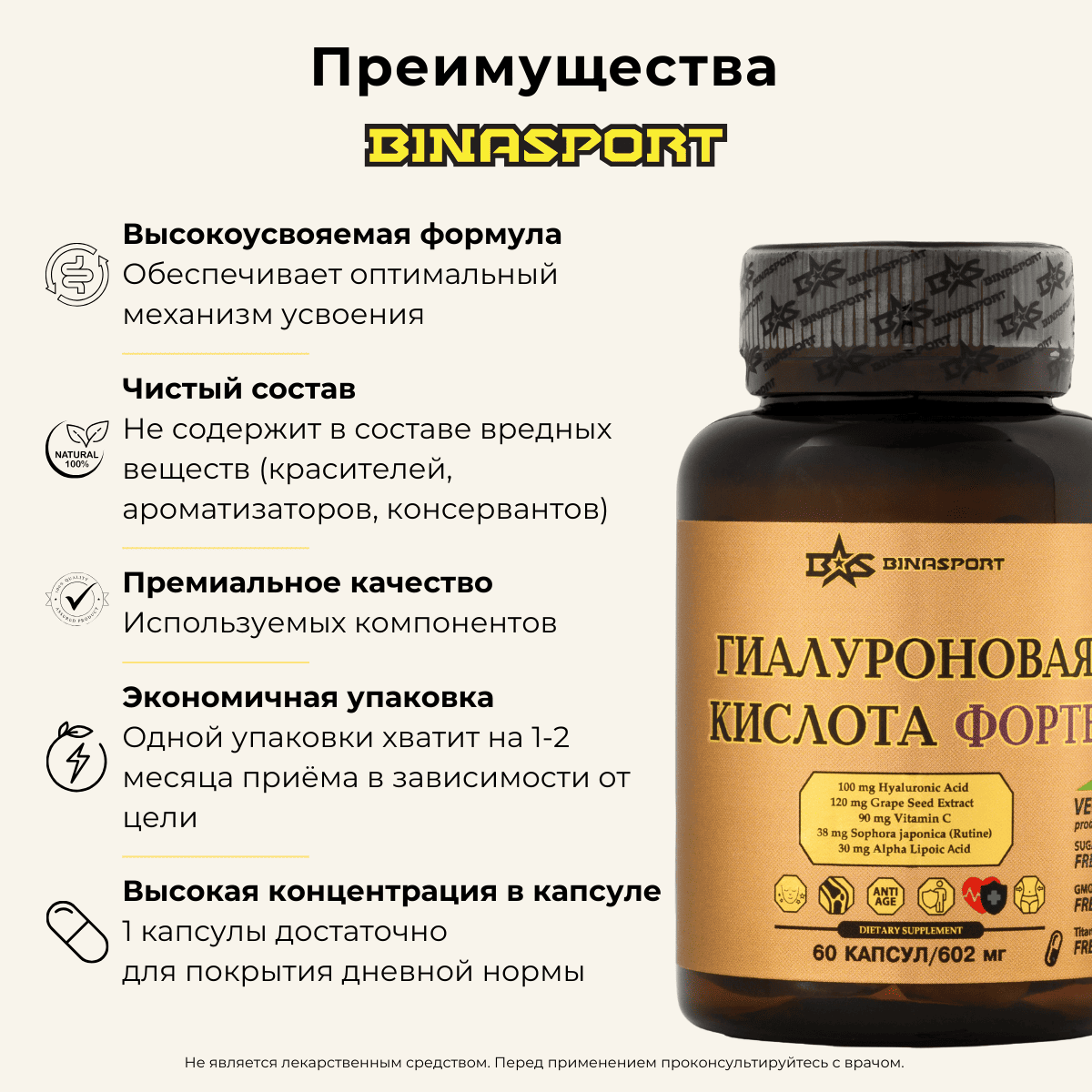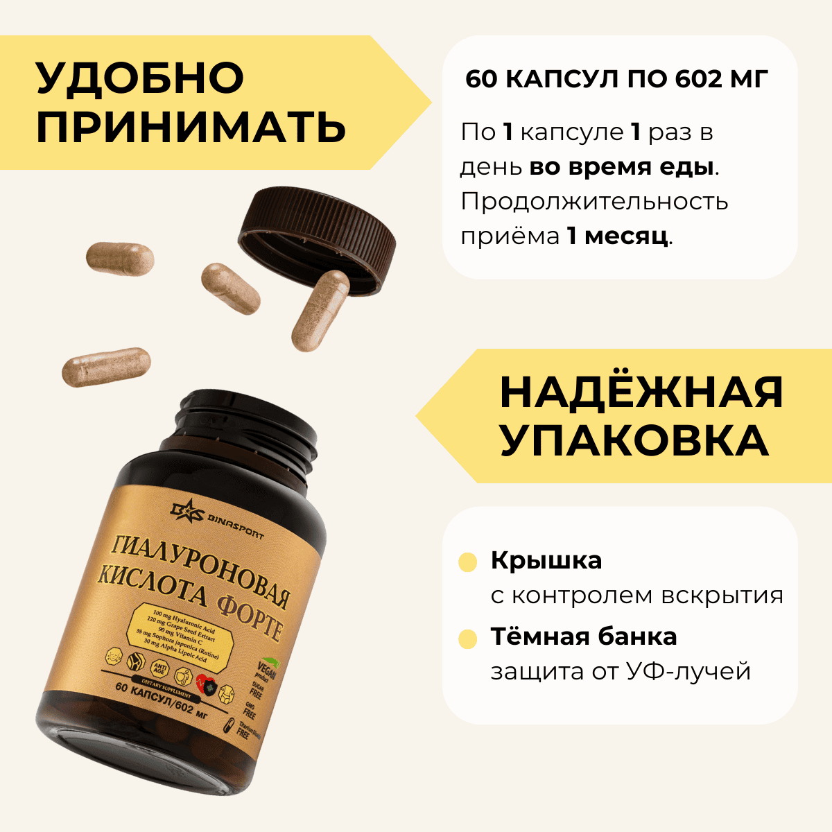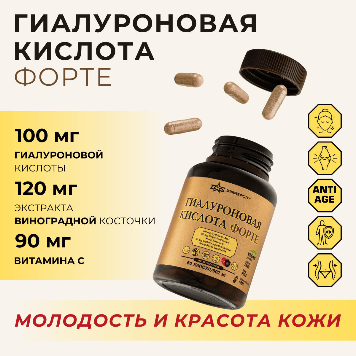 Гиалуроновая кислота присутствует во всех тканях организма и играет важную роль в поддержании водного баланса в клетках и межклеточном пространстве, поддерживает упругость, эластичность и гладкость кожи на тканевом уровне, способствует восстановлению суставных хрящей. Гиалуроновая кислота необходима для восстановления и поддержания водного баланса кожи, профилактики заболеваний опорно-двигательного аппарата, замедления процессов старения. Кроме того, употребление гиалуроновой кислоты снижает утомляемость глаз, сохраняет конъюнктиву увлажненной даже при длительной работе за компьютером и использовании контактных линз. Облегчает состояние при атопическом дерматите, способствует предотвращению климактерических расстройств. Гиалуроновая кислота улучшает состояние суставов, повышает их подвижность, снимает ревматическую и артрическую боль.